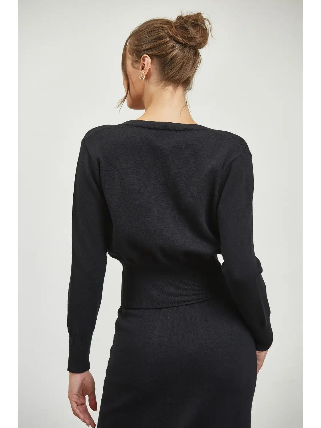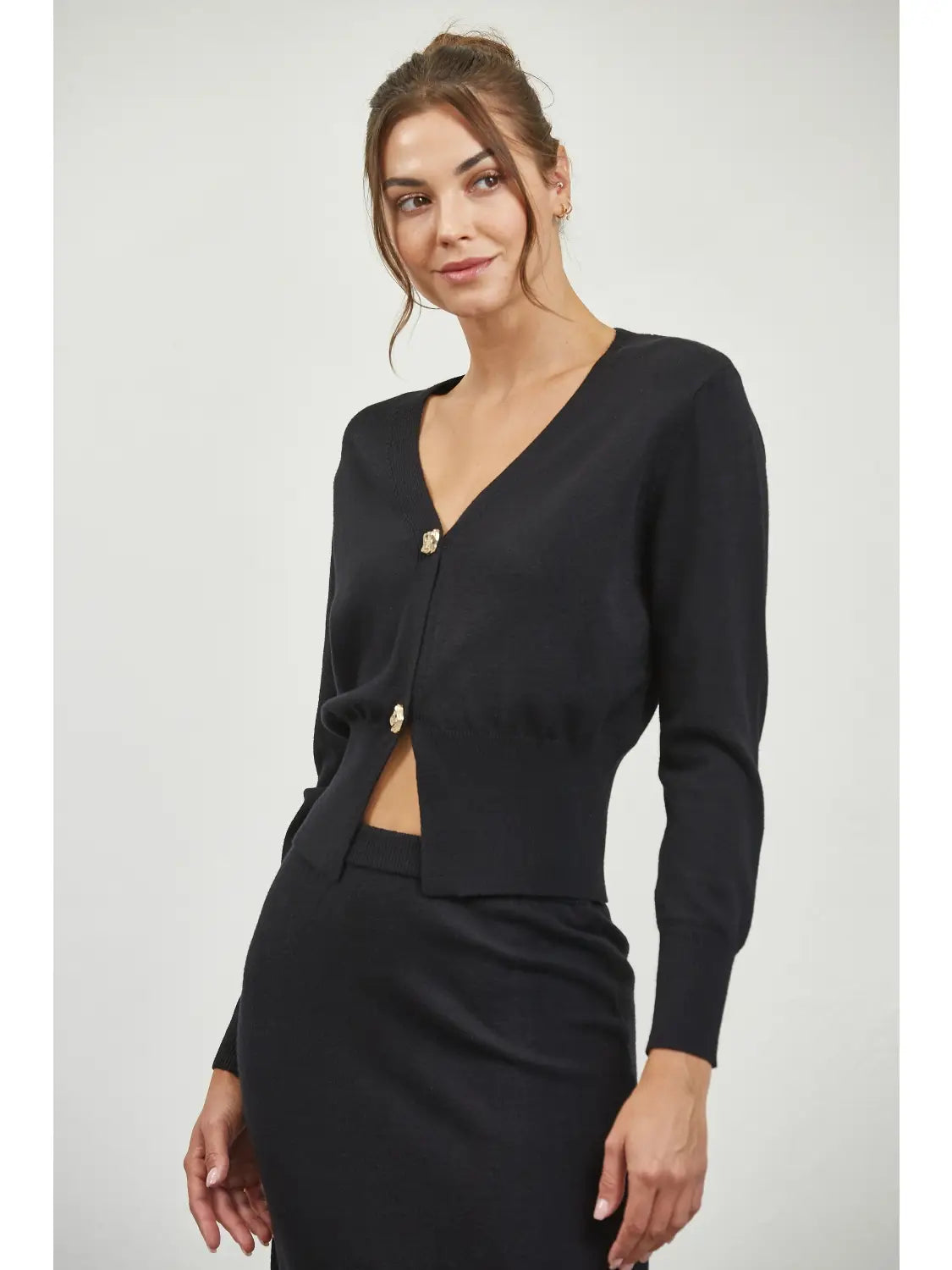 Meet your new favorite layering piece—a cropped long sleeve cardigan that hits just right. Featuring bold metal buttons and a flattering shortened silhouette, it's designed to show off your style without trying too hard. Style it for work or night time, it's just the right amount of attitude.